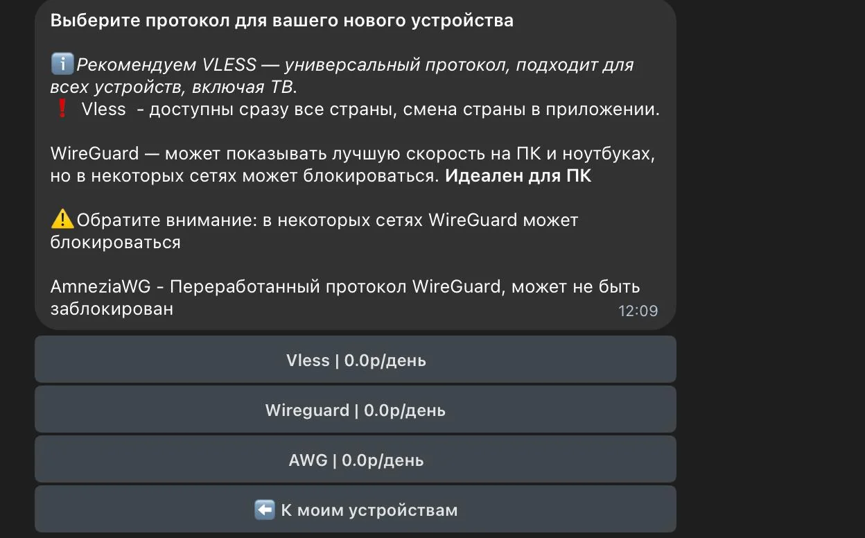 Благодаря интеграции с Telegram-ботом, AmneziaWG стал действительно удобным. Вы не думаете о серверах, ключах и туннелях. Просто запускаете бот, выбираете устройство и получаете всё готовое.