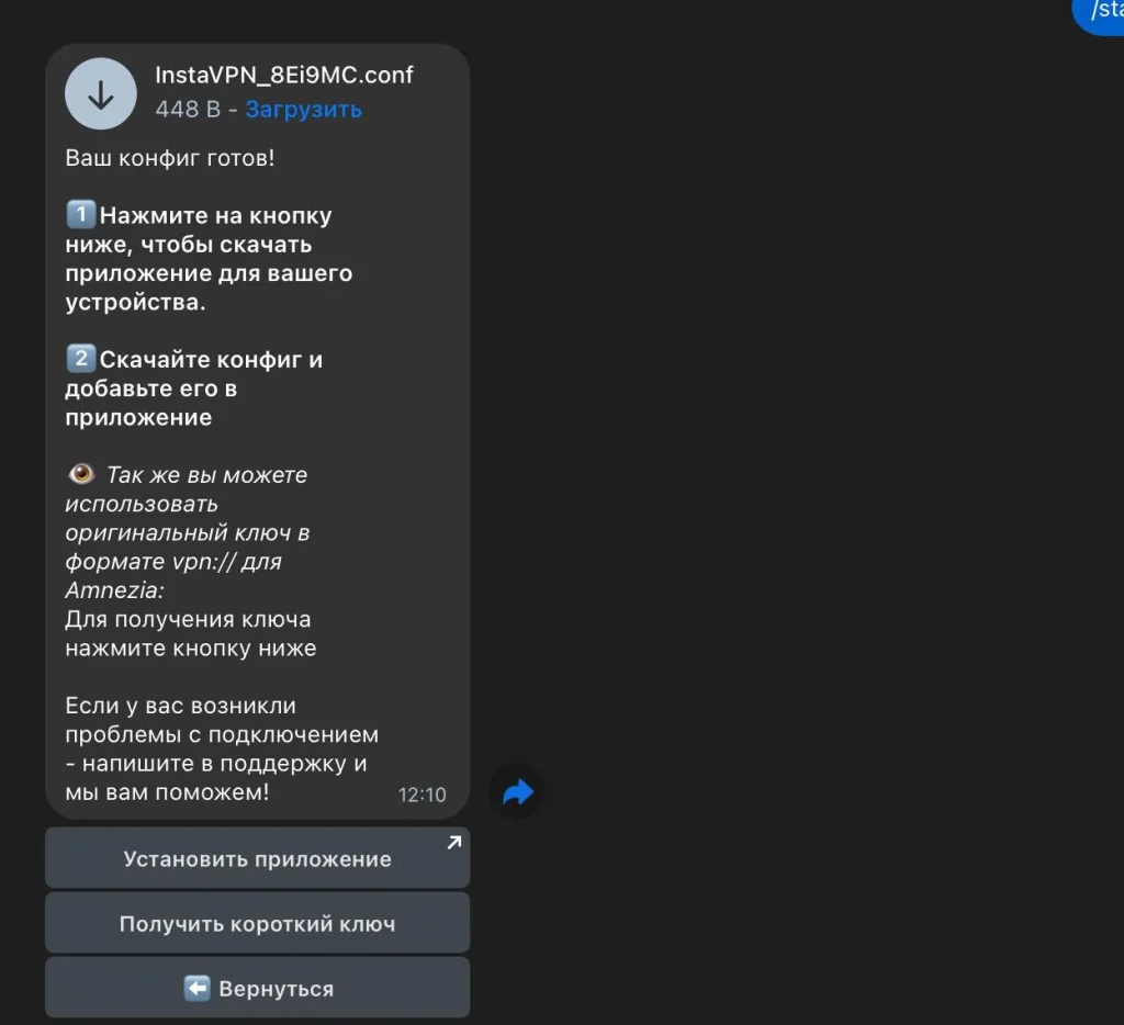 Бот выдаст вам готовый .conf-файл и предложит скачать сам клиент AmneziaWG. Этот файл можно сразу импортировать в приложение — и всё готово!