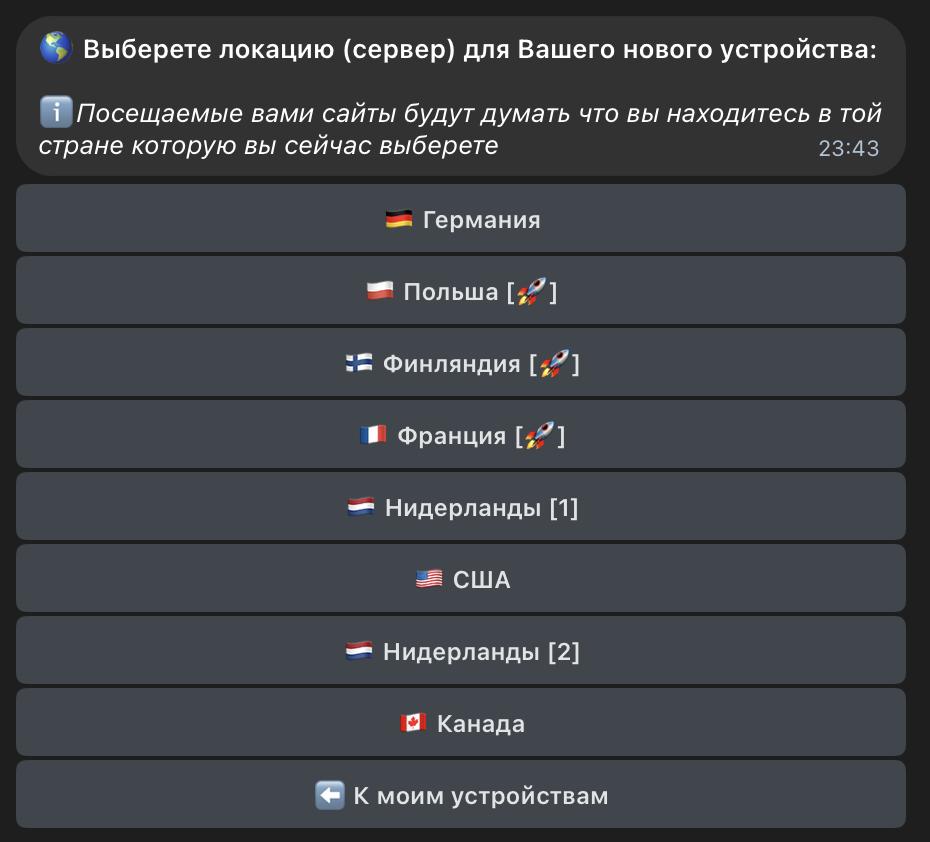 Выбирайте страну, к которой хотите подключиться. Доступны 🇩🇪 Германия, 🇵🇱 Польша, 🇫🇮 Финляндия и другие (список постоянно расширяется).